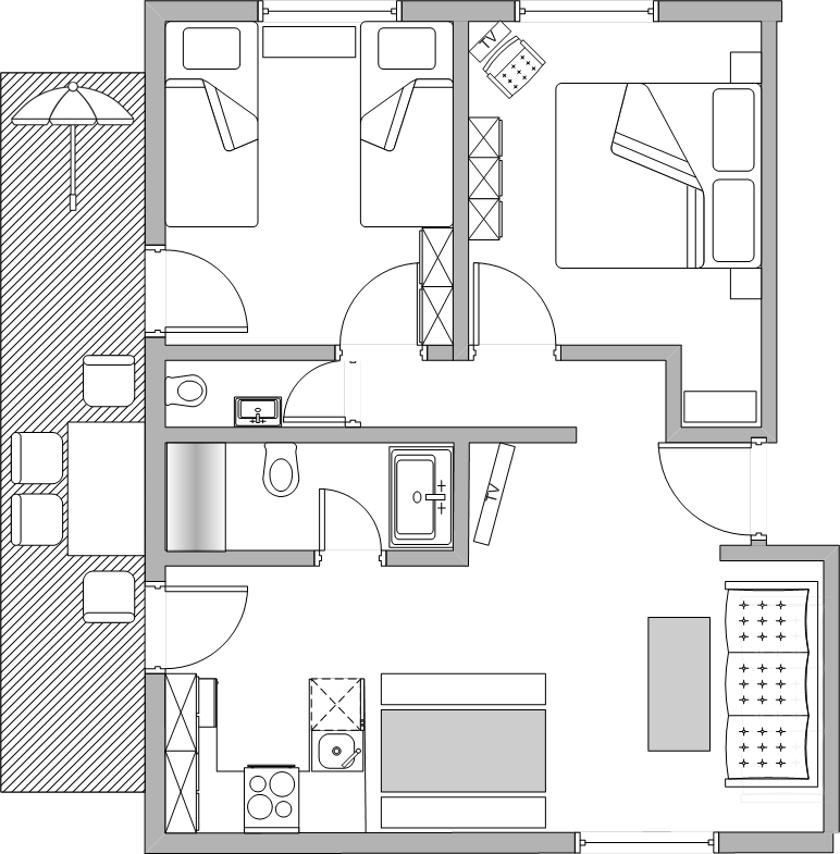 Schlafzimmer mit Doppelbett und TV, Schlafzimmer mit zwei Einzelbetten , Badezimmer mit Fön, Dusche und WC, zusätzliches WC, Wohnbereich mit Couchgarnitur (ausziehbar) und Flatscreen-TV (42"). Volleingerichtete, große Küche mit Backofen, Kühlschrank mit Gefrierfach, Geschirrspüler, Wasserkocher, Senseo Pad Kaffeemaschine, Mikrowelle, Toaster und gemütlicher Essecke. Balkon zur Alleinnutzung. Die Wohnung ist mit Insektenschutzgittern ausgestattet. Gerne stellen wir Ihnen einen kostenlosen W-LAN Anschluß sowie einen Parkplatz zur Verfügung. Bitte beachten Sie, daß das Rauchen nur auf dem Balkon gestattet ist.