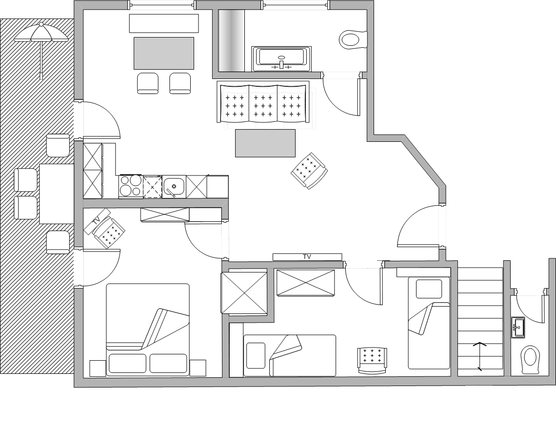 Schlafzimmer mit Doppelbett und TV, Schlafzimmer mit zwei Einzelbetten , Badezimmer mit Fön, Dusche und WC, zusätzliches WC , Wohnbereich mit Couchgarnitur und Flatscreen-TV (55"). Volleingerichtete, große Küche mit Backofen, Kühlschrank mit Gefrierfach, Geschirrspüler, Wasserkocher, Senseo Pad Kaffeemaschine, Mikrowelle, Toaster und gemütlicher Essecke. Balkon zur Alleinnutzung. Die Wohnung ist mit Insektenschutzgittern ausgestattet. Gerne stellen wir Ihnen einen kostenlosen
